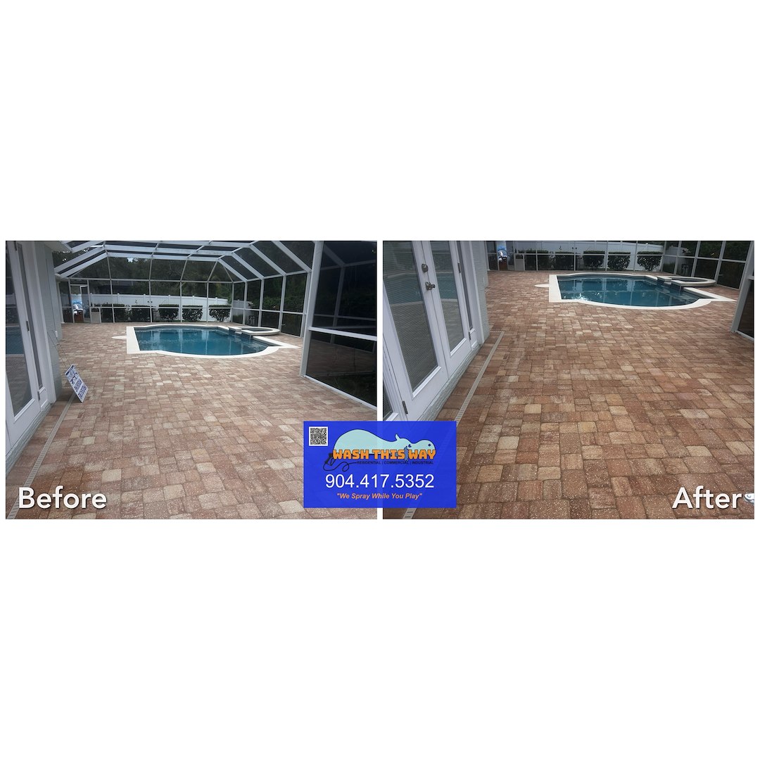 Our paver cleaning and sealing service is a perfect example of why Wash This Way has earned a reputation as the go-to provider for residential pressure washing in St. Augustine, FL. Over time, pavers inside pool enclosures can become discolored from mildew, mold, algae, and everyday wear. Without proper maintenance, this buildup can cause staining and even damage, diminishing the beauty of one of the home’s most relaxing spaces. By cleaning and sealing the pavers, we not only restored their original vibrancy but also protected them against future weathering and fading, ensuring they remain durable and attractive for years to come. Residents across St. Johns County trust Wash This Way for reliable and affordable exterior cleaning, whether it’s pressure washing siding, brightening gutters, restoring driveways, or enhancing patios and pool decks with professional sealing. We know that residential pressure washing is about more than just looks—it’s about safeguarding your property and extending the life of your home’s surfaces. If you’re searching for the best St. Augustine pressure washing company to help revitalize your outdoor spaces, Wash This Way is ready to exceed your expectations. Contact us today to schedule your next paver cleaning, sealing, or residential pressure washing service in St. Augustine, FL, and let us bring back the curb appeal, cleanliness, and beauty your home deserves.